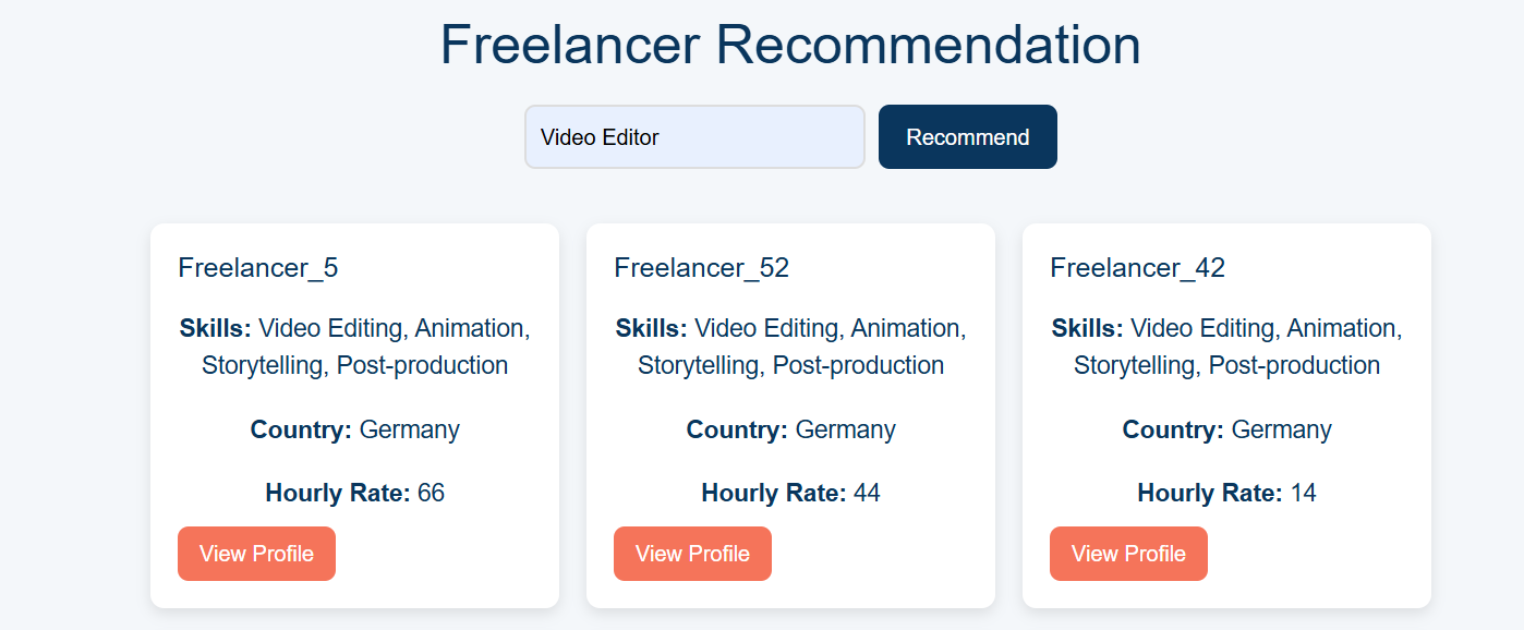A Freelancer Recommendation System that leverages precomputed similarity metrics to match clients with the most suitable freelancers. Built with a Flask backend for efficient data handling and a simple yet functional HTML/CSS frontend, it streamlines the process of finding ideal freelance talent.